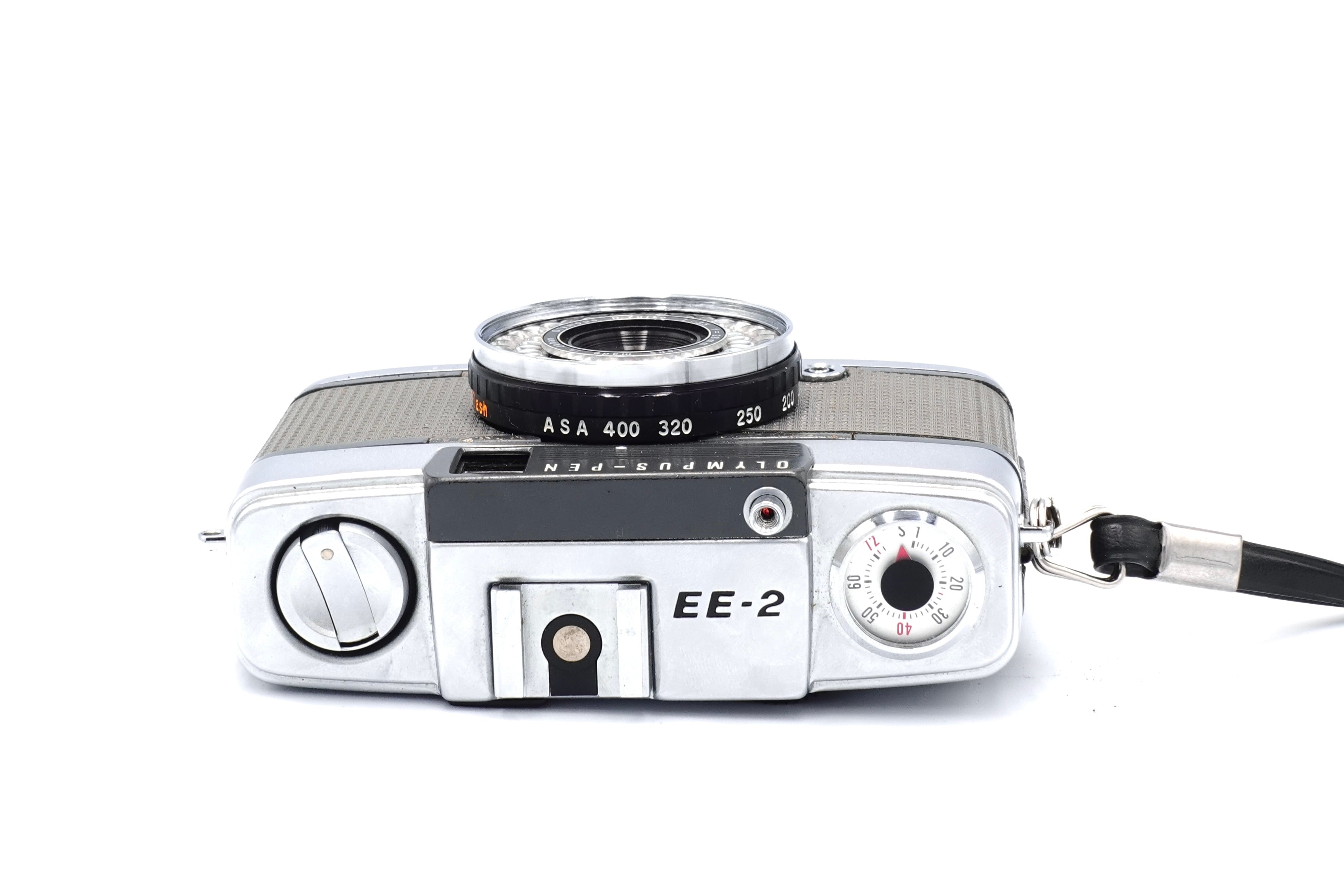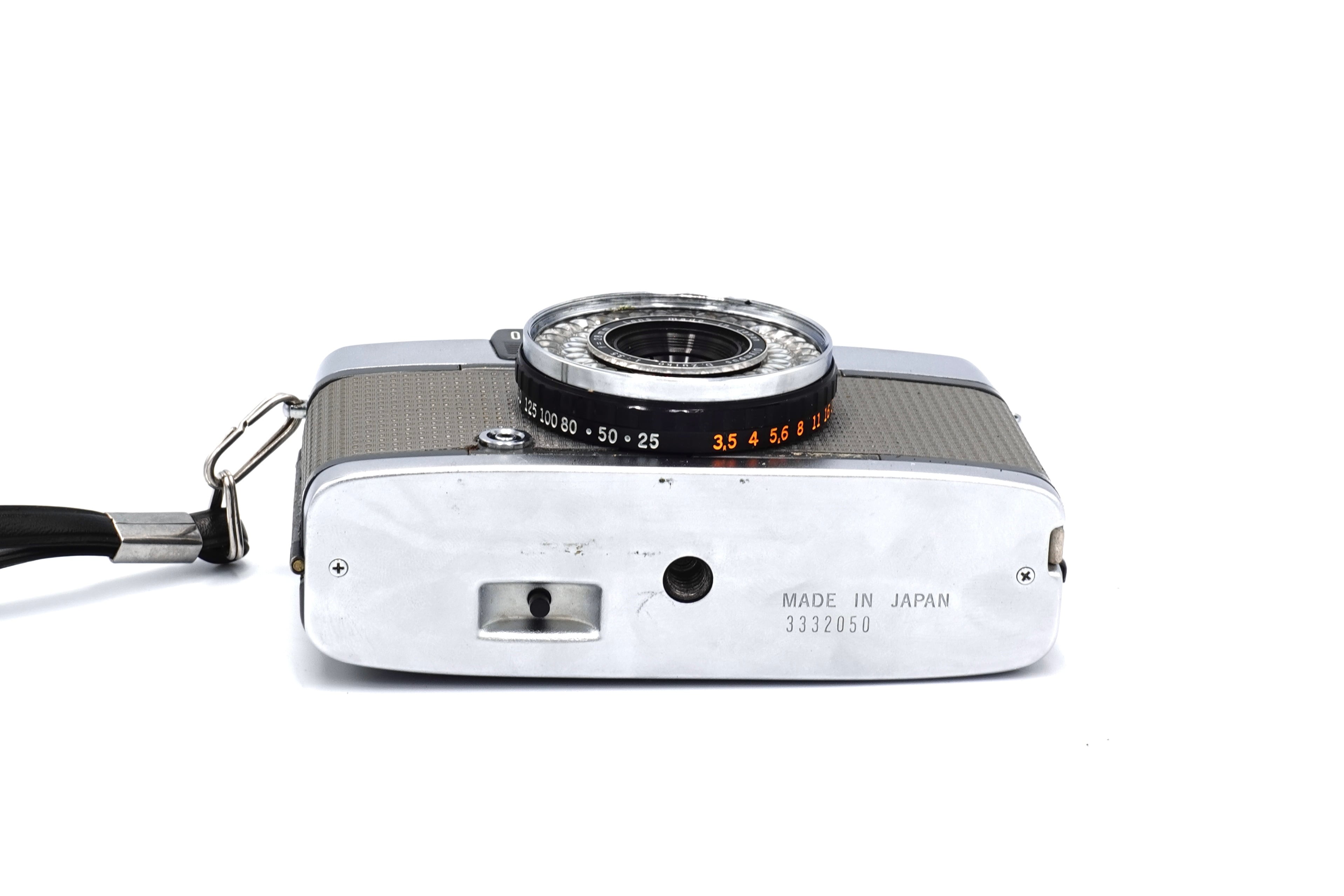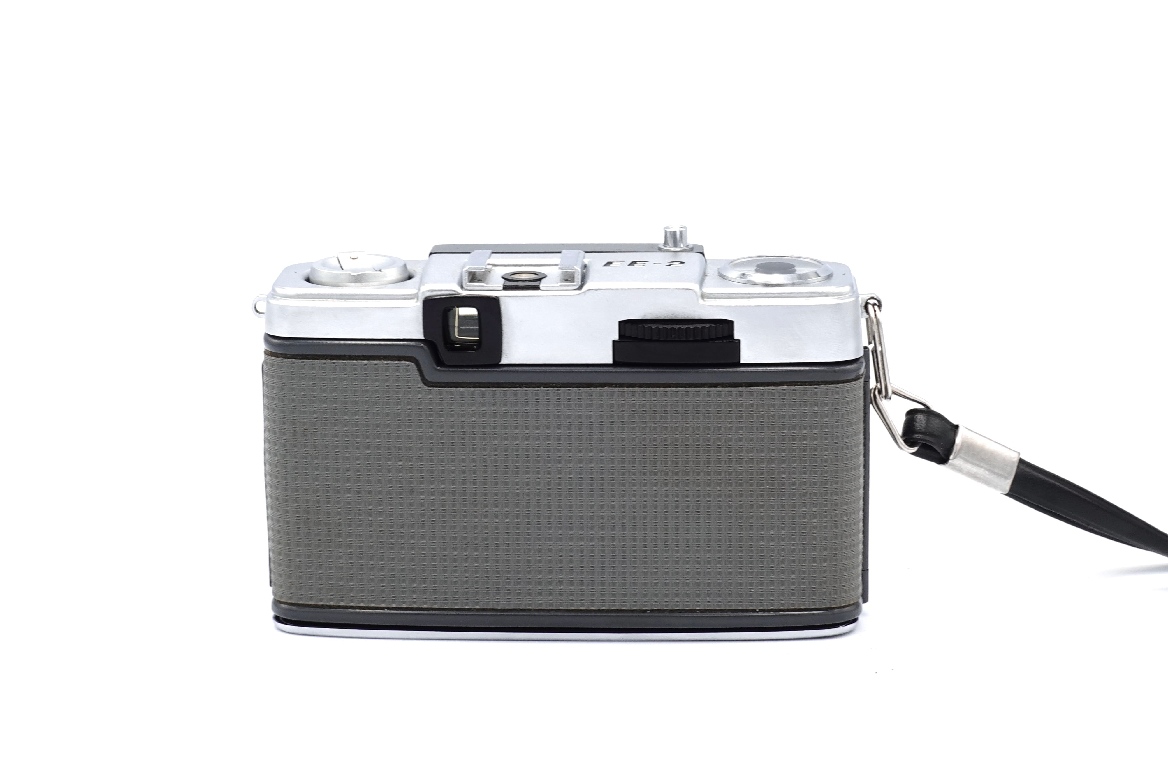 オリンパスペンEEシリーズの2代目、EE-2です。裏蓋は蝶番式でフィルムカウンターも自動復元式になっています。撮影操作のシンプルさはそのままに、さらに余計な操作を省いた手軽なハーフカメラです。レンズはD.Zuiko 28mm F3.5です。