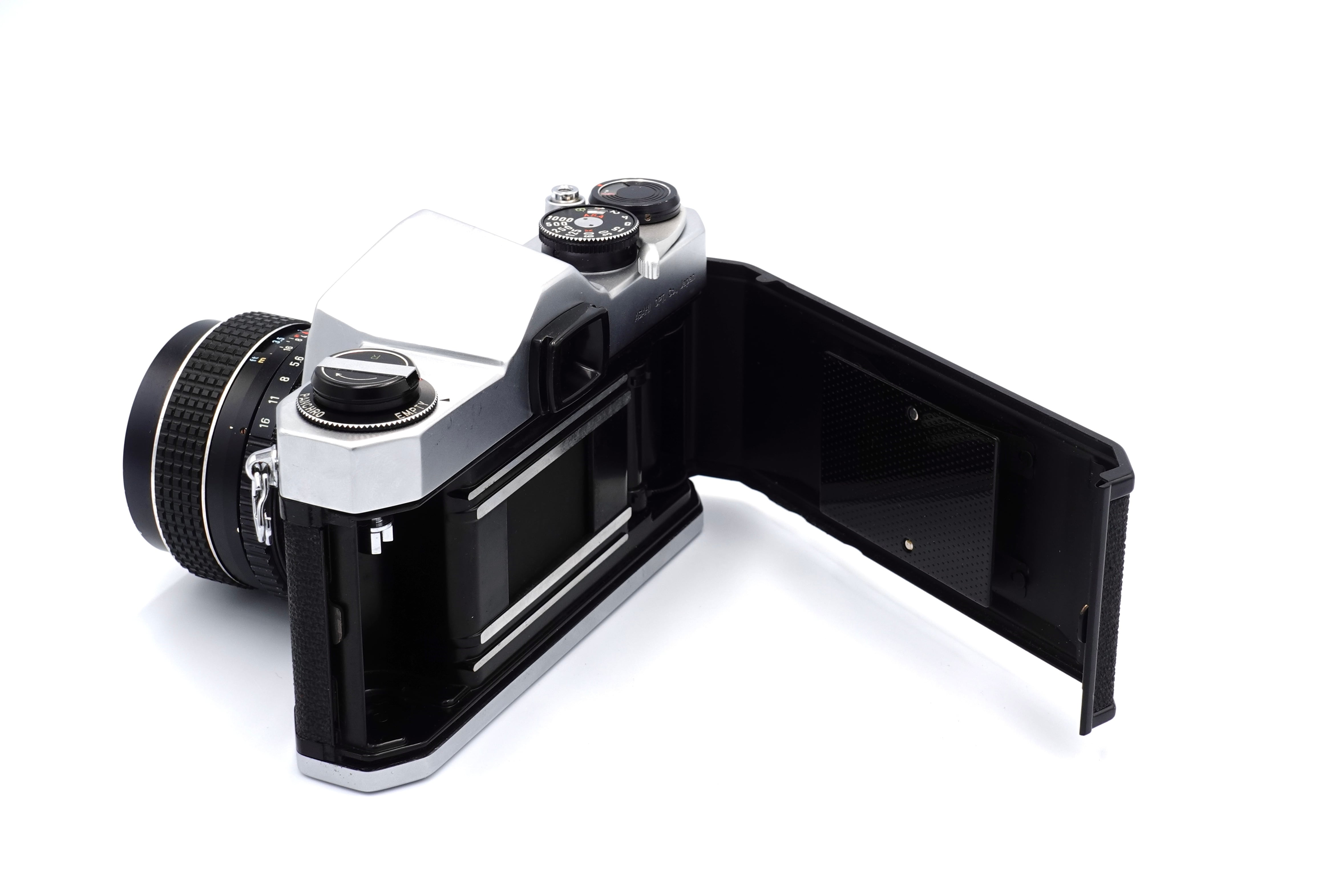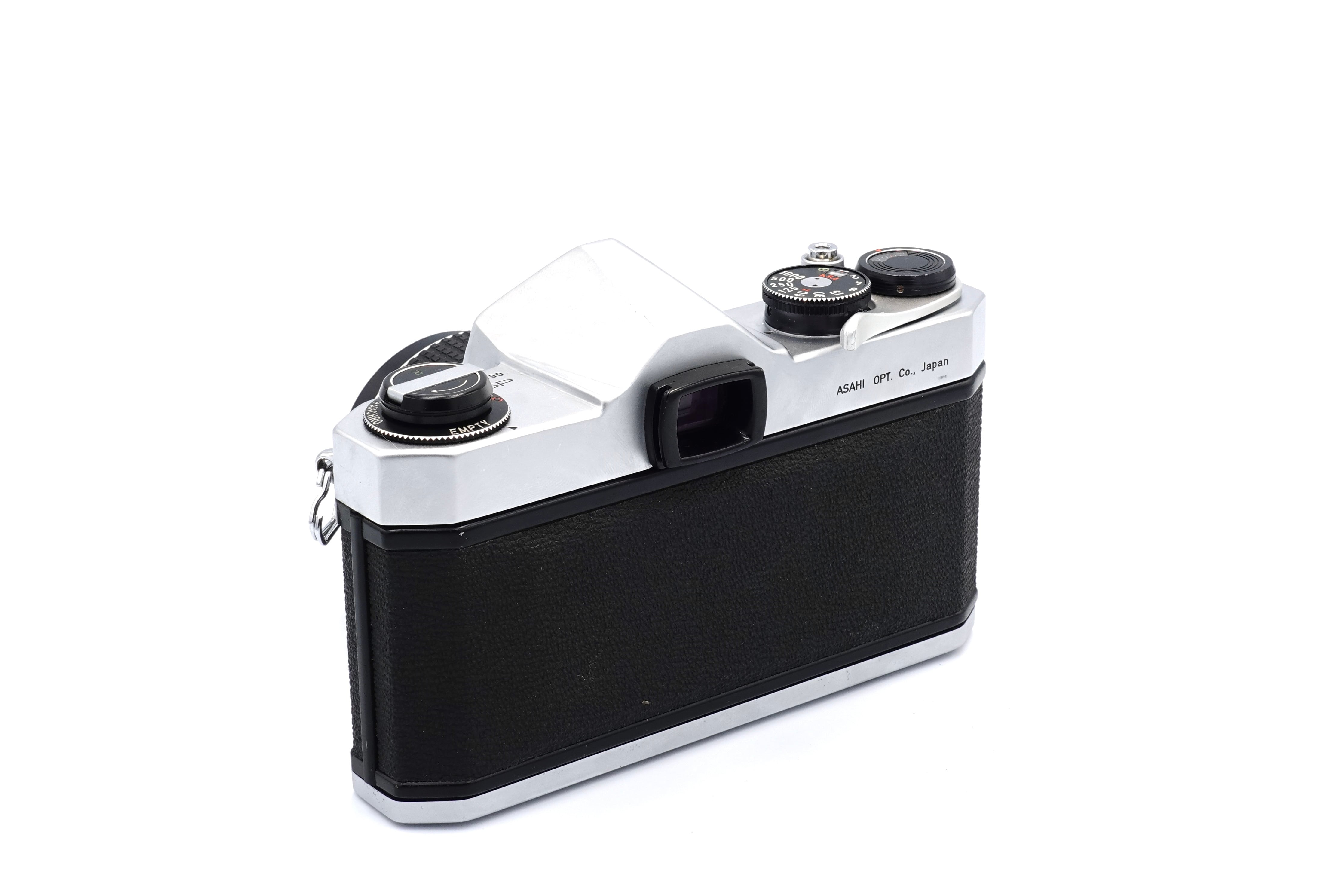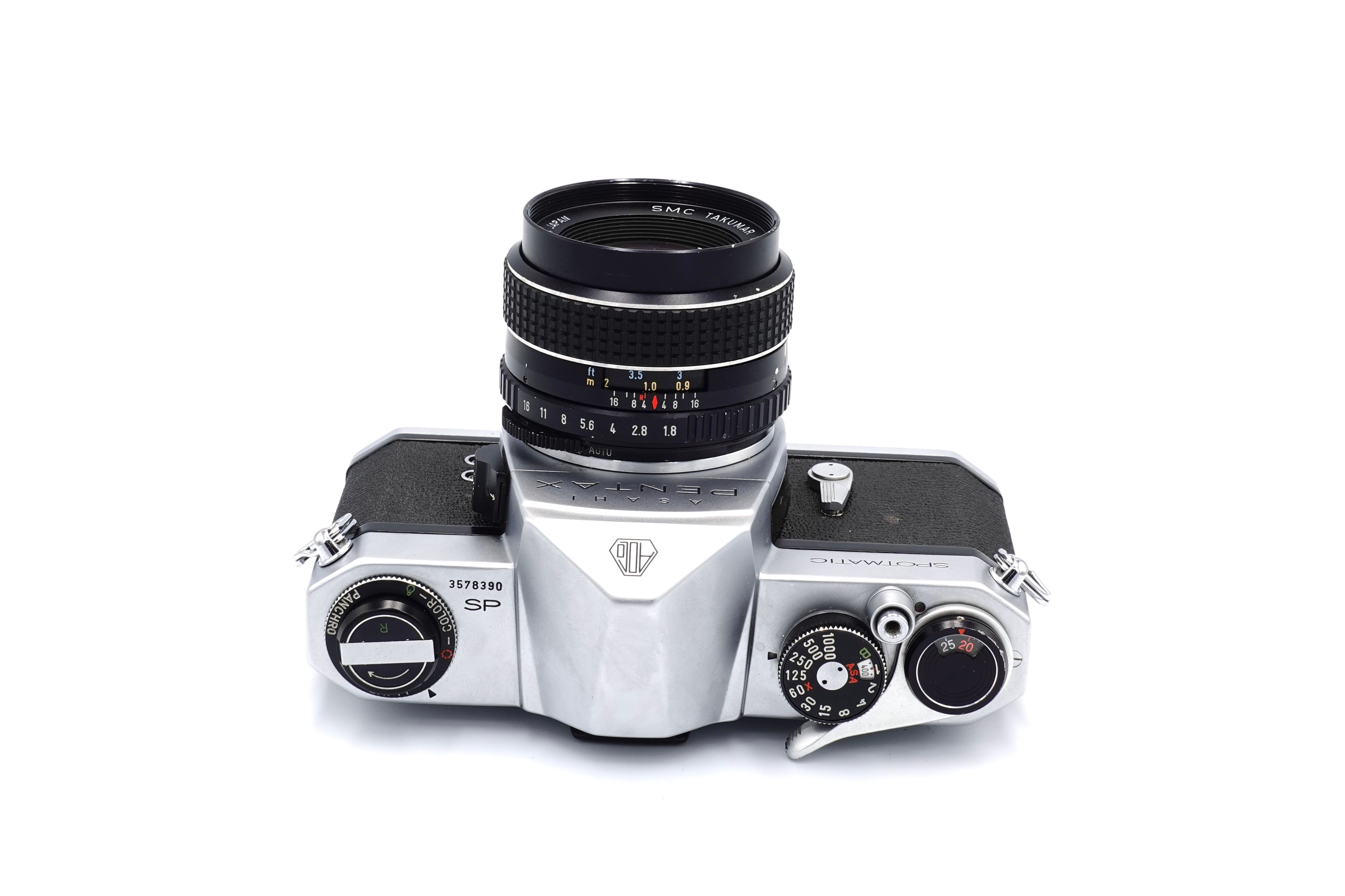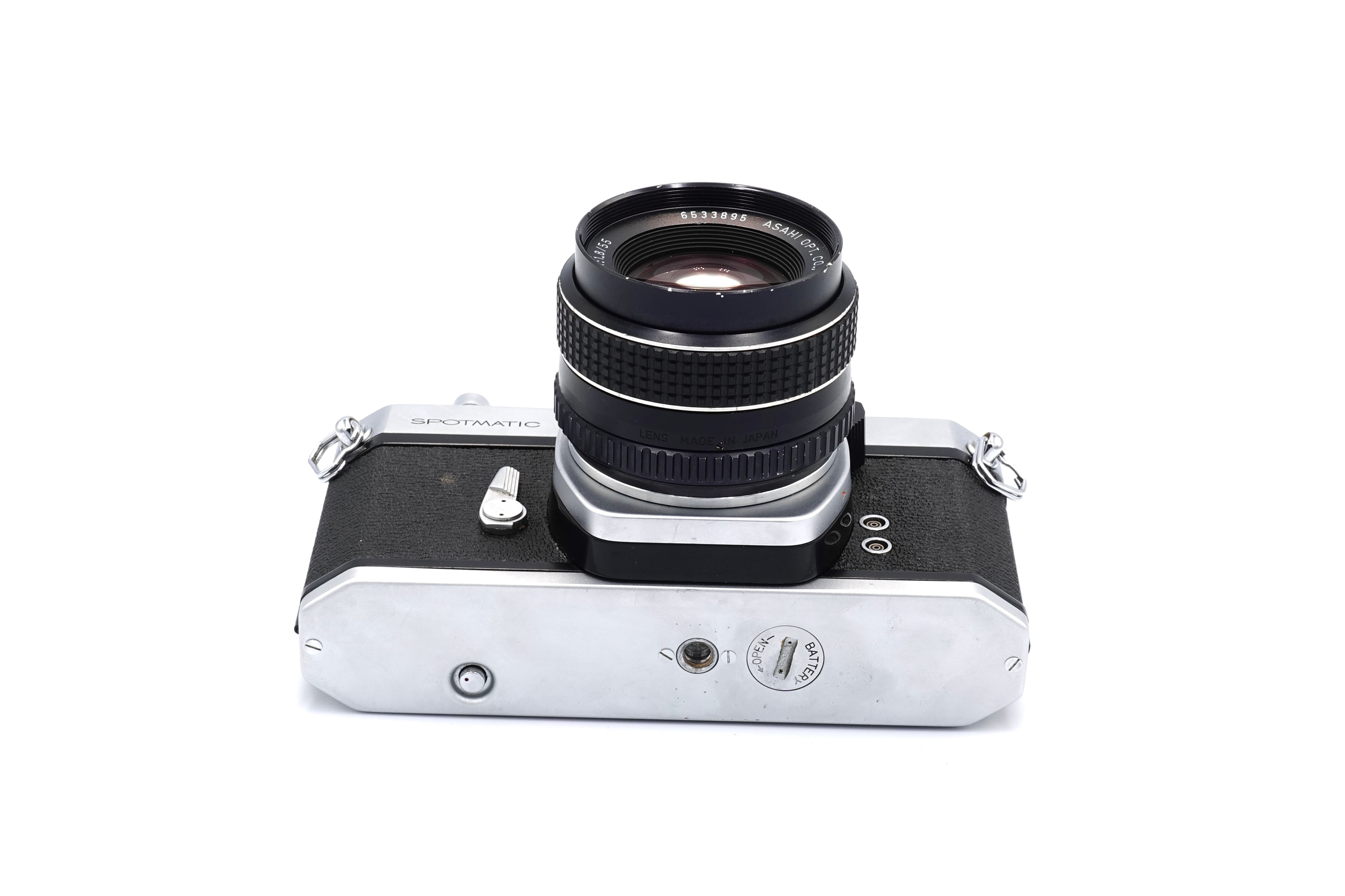 外観はやや使用感がみられます。レンズはSMC TAKUMAR 55mm F1.8です。細かいチリの混入がありますが清掃して綺麗な状態です。
