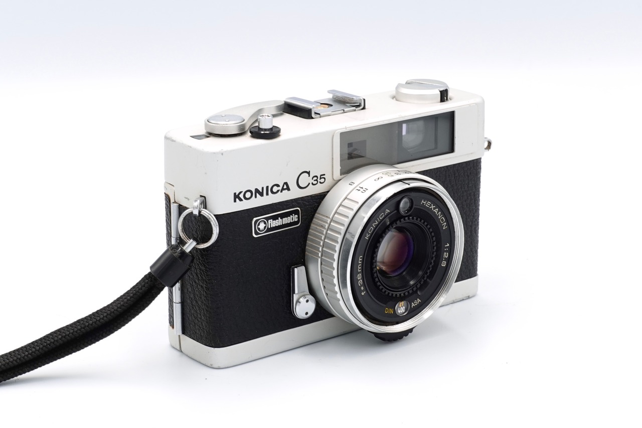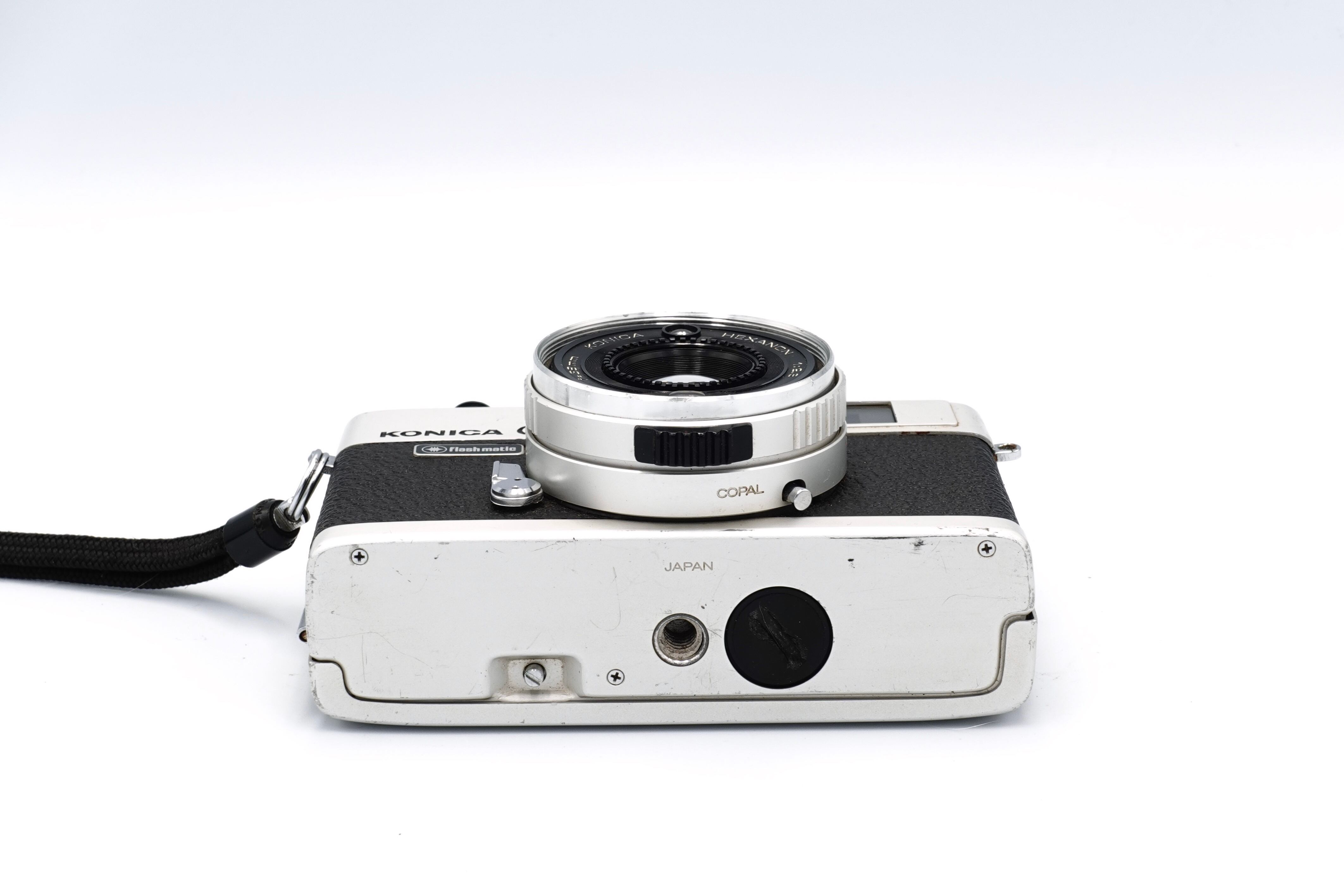 コニカC35フラッシュマチックです。フラッシュを装着してガイドナンバーを合わせると、自動で露出を合わせてくれます。とはいえ基本的なスペックはC35とほとんど変わりません。