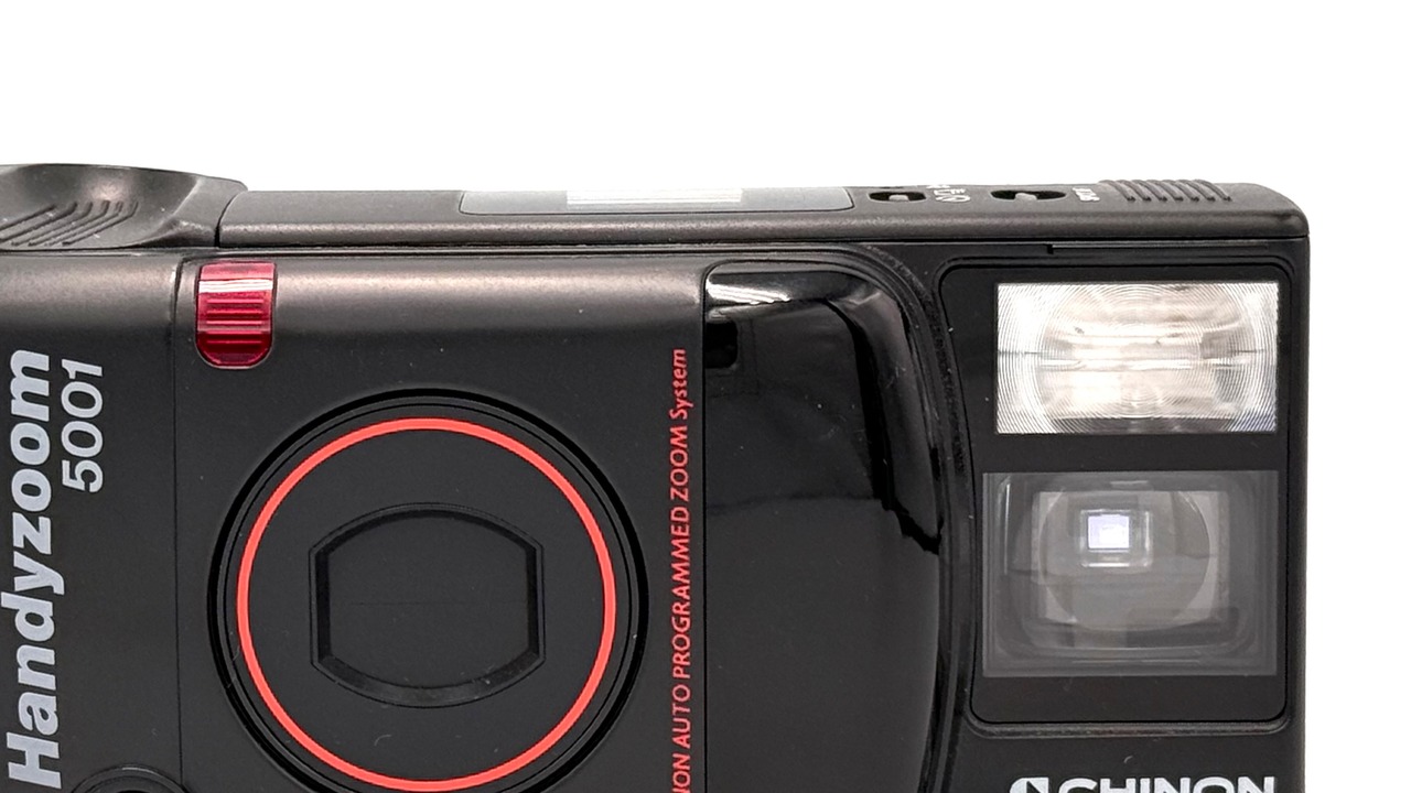 チノンのズームレンズ搭載AFカメラ、ハンディズーム5001です。きわめて特徴的な形状をしており、ズームイン、ズームアウトも底面のボタンで操作します。またズームレンズの操作をオートにする撮影モードがあり、どういった場面で役に立つのかイメージしづらいですが、被写体に応じてカメラが自動的に画角を調整します。