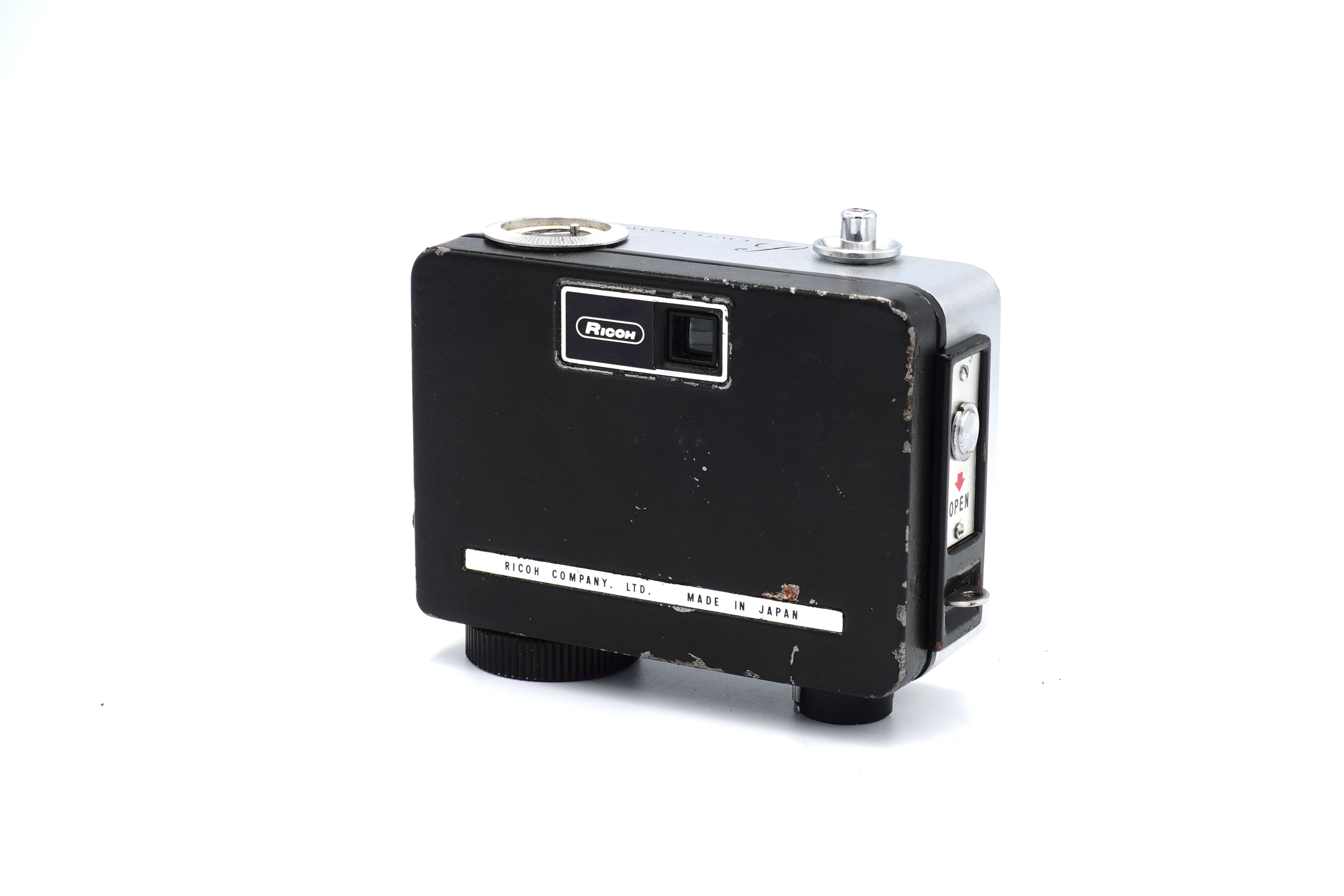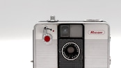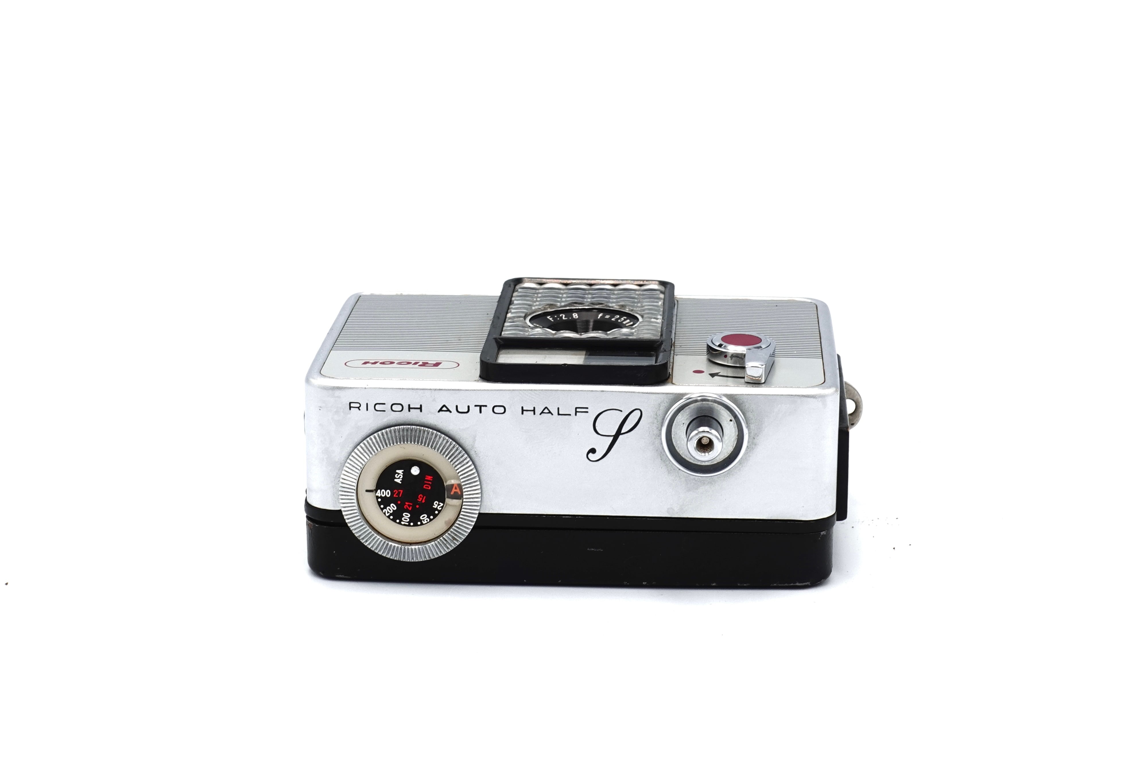 リコーのハーフカメラ、オートハーフSです。セルフタイマーが搭載され、シャッターボタンがカメラ前面から上部に移動しています。ゼンマイ式の巻き上げ機構が独特なカメラです。セレン露出計が動作せず、フラッシュと同時にマニュアルで使用せざるを得ない状態です。被写体との距離に合わせて絞りを設定してください。