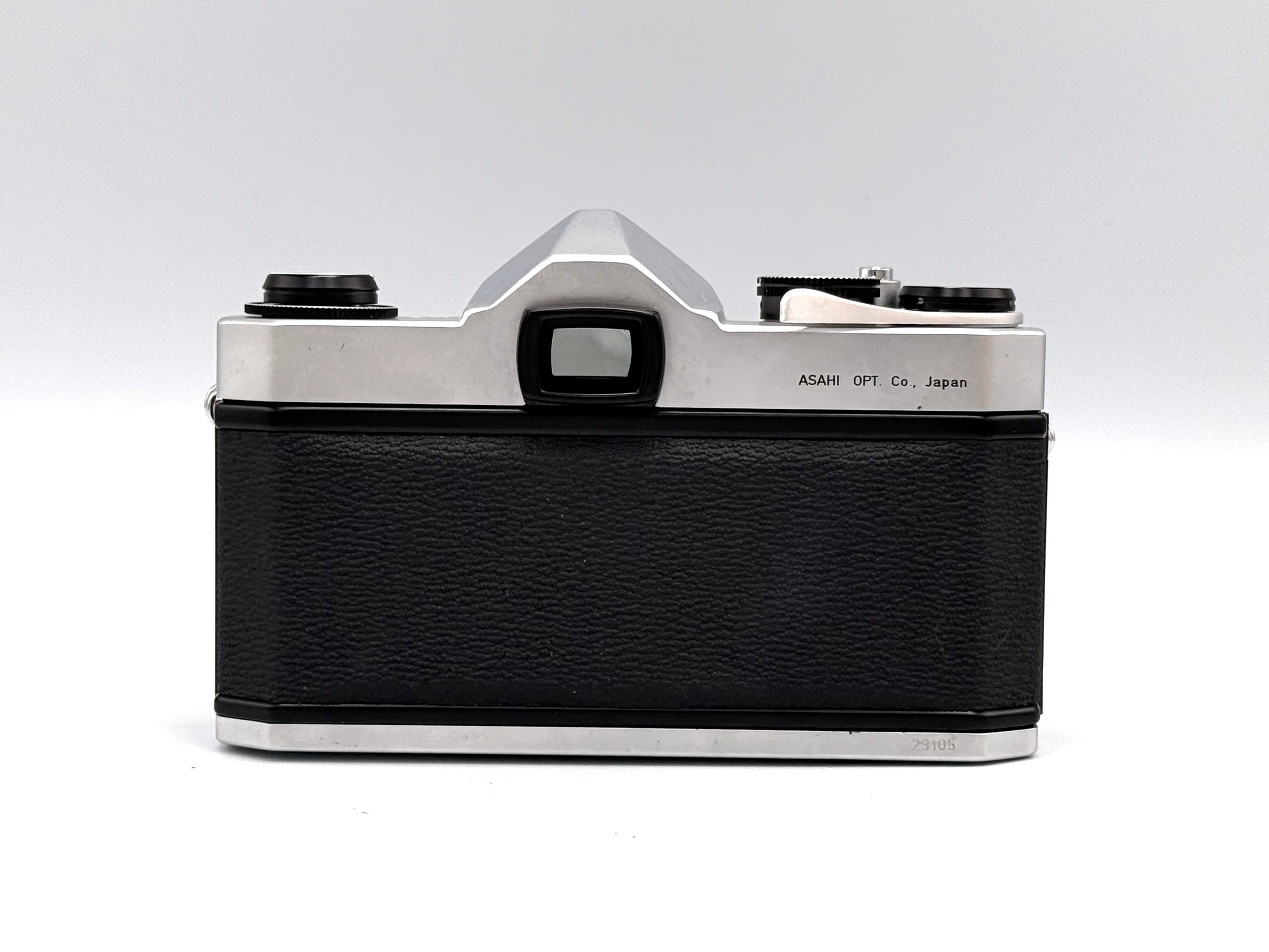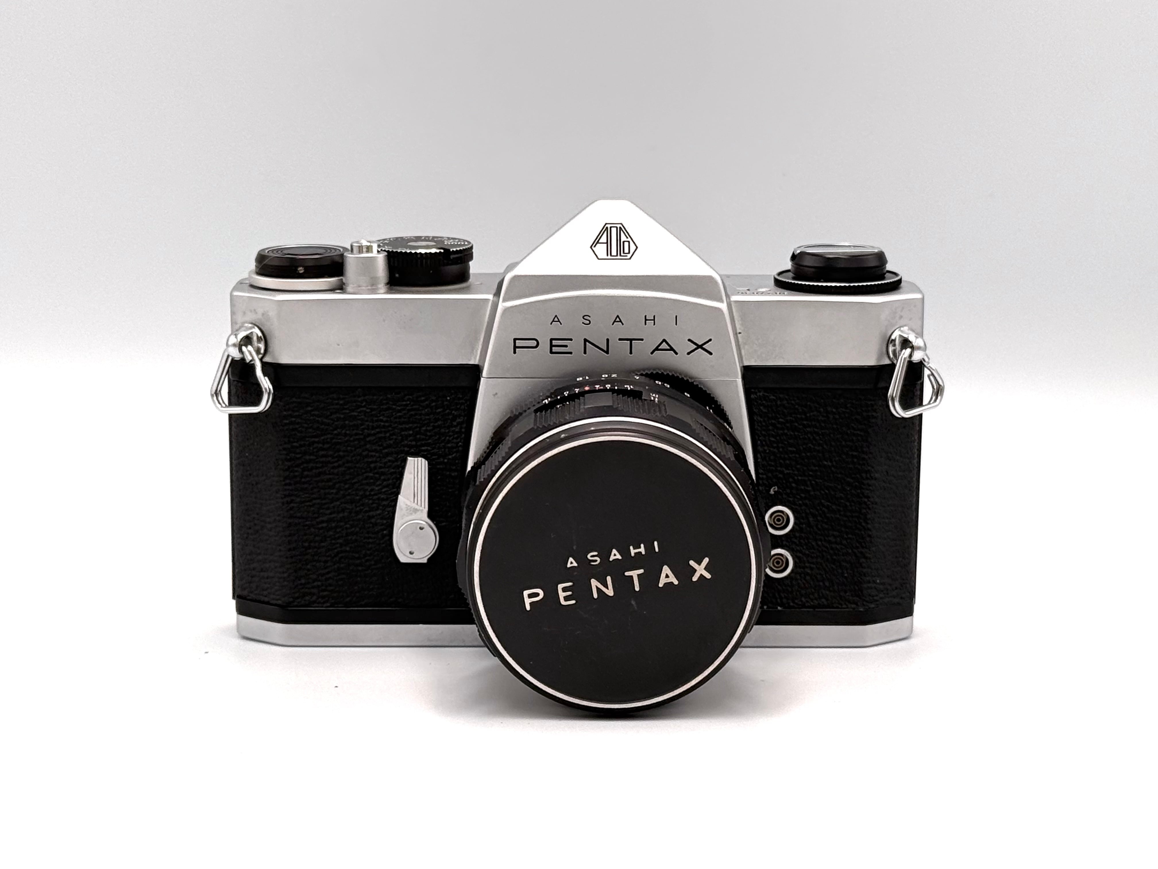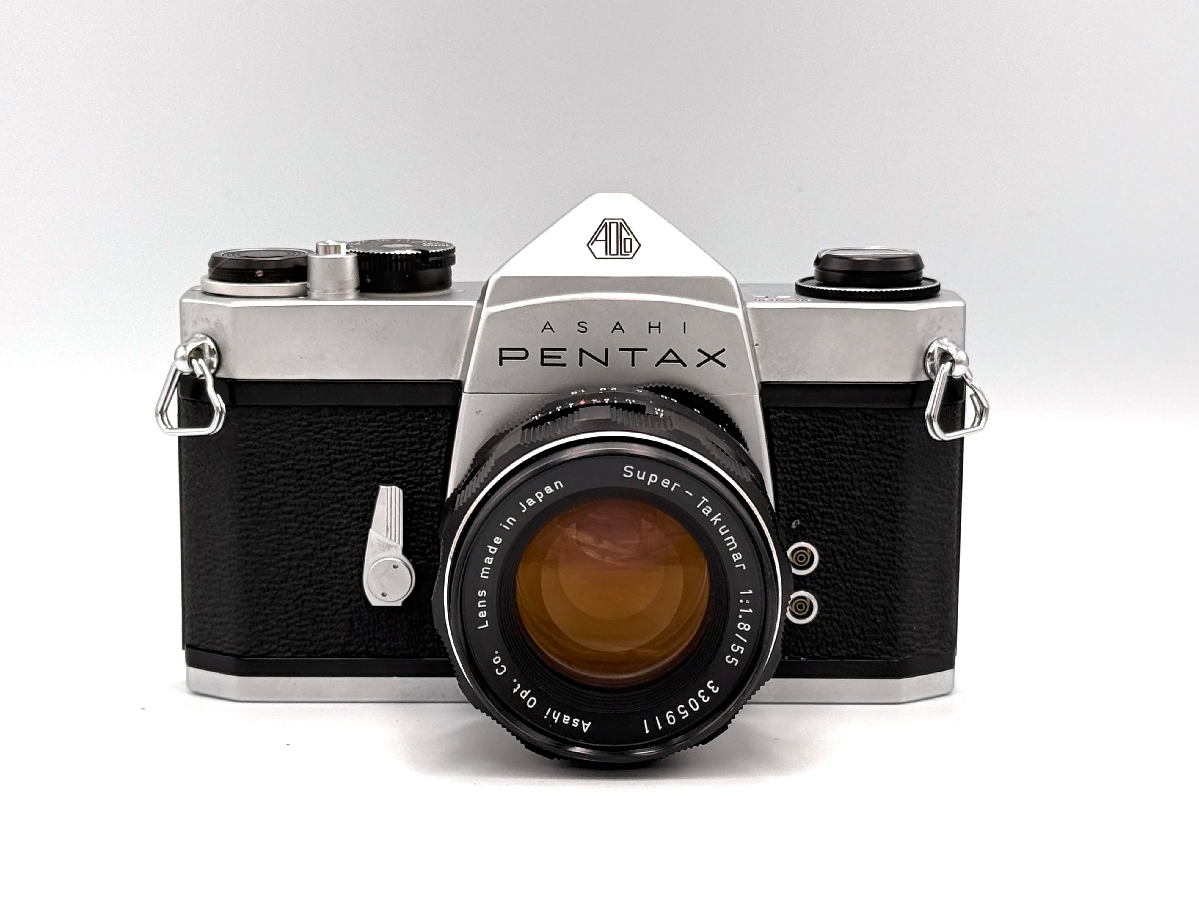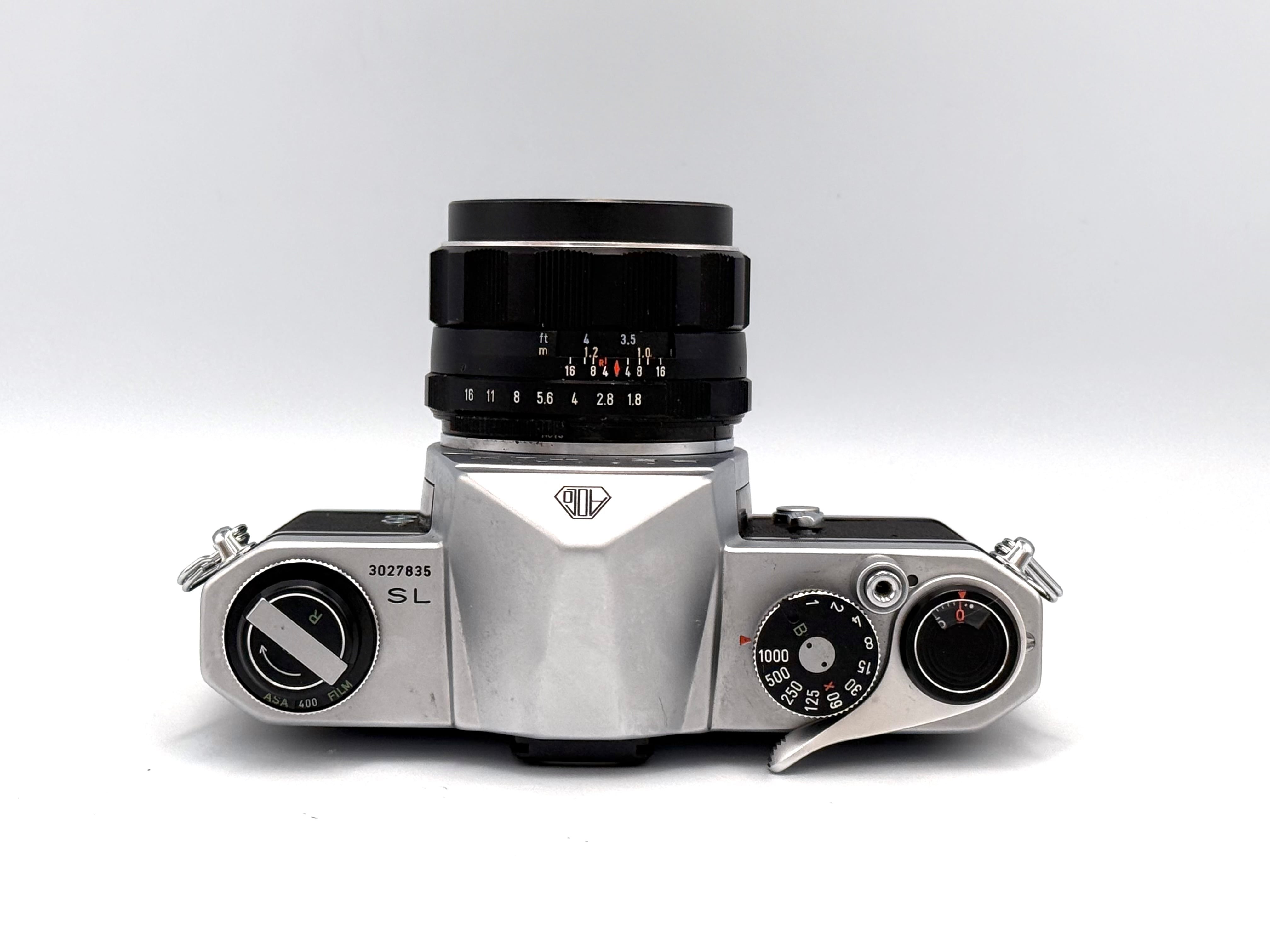 ペンタックスのM42マウント機械式一眼レフ、SLです。SPから露出計を省いたモデルで、外観も似ています。ファインダー内は余計な表示がなくすっきりしており、構図に集中できるのが利点です。レンズはスーパータクマー55mm F1.8です。ボディ外観はやや使用感がみられます。レンズは細かいチリが少々ありますが清掃して綺麗な状態です。